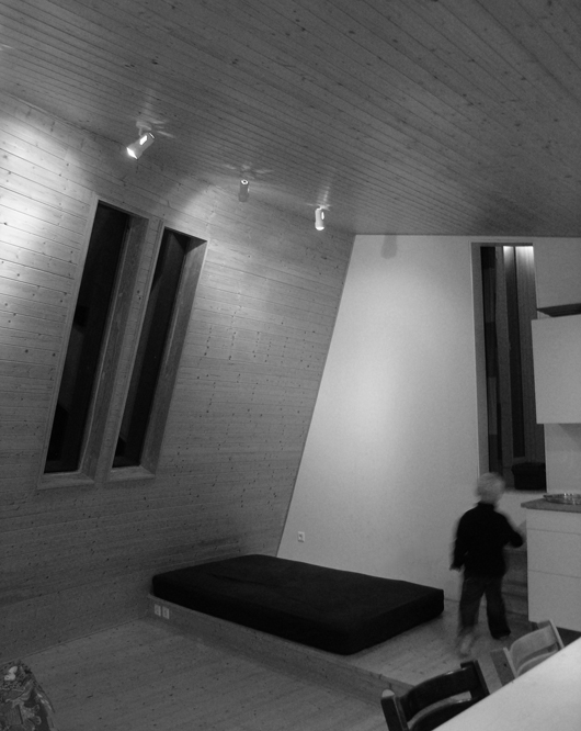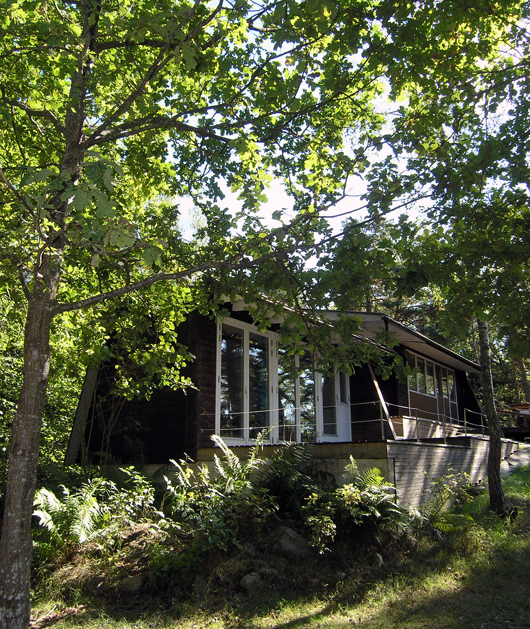 The house has a panel of smooth planed wood with pigmented tar, that gives away a nice scent and allows the grainingof the tree to show. Its genorous windos opens up to the sea and the sailors along Furusundsleden in Stockholm archipelago. The house also have skylights from where you can see a 100 years old oak and the summer nights starry sky.