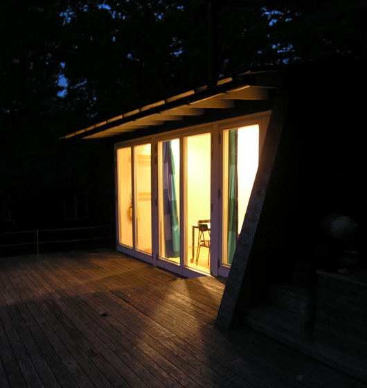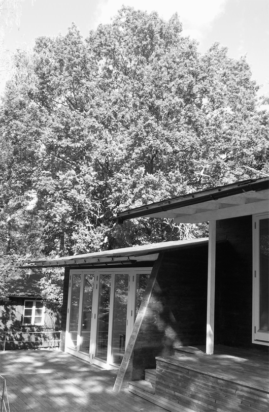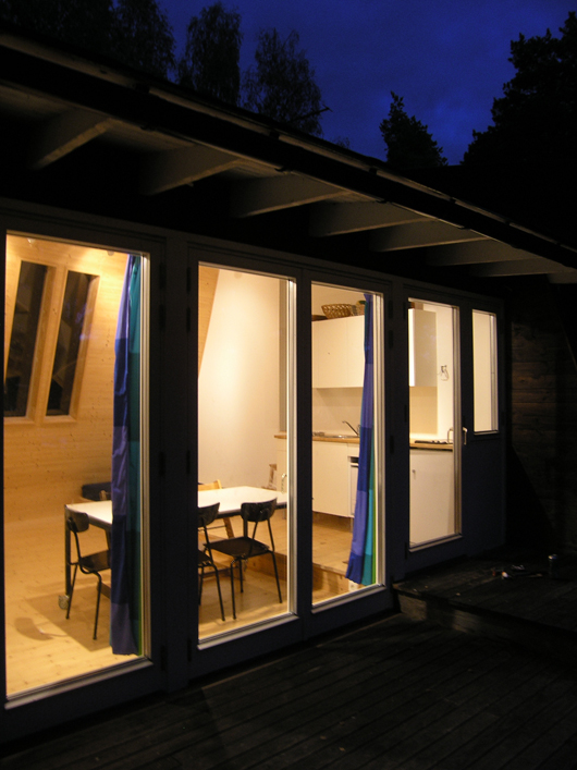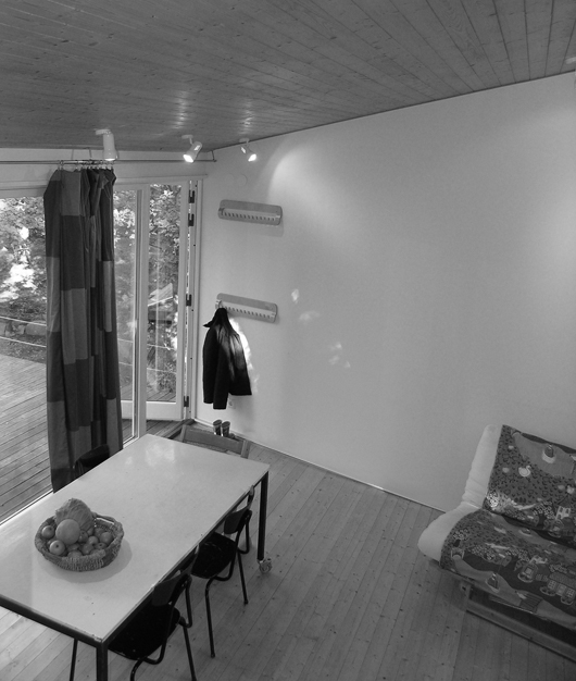 Huset har en släthyvlad träpanel bestruken med kimrökspigmenterad tjära, som doftar gott och släpper igenom träets ådringsmönster. Huset öppnar sig med generösa glaspartier med utsikt mot havet och seglare längs Furusundsleden i Stockholms skärgård. Huset öppnar sig också med takfönster med utsikt över en 100-årig ek och sommarhimlens stjärnkonstellationer.