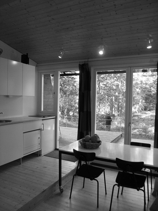 Fritidshuset står på en bergsformation, som stupar 4 meter tvärt mot norr. Med samma vinkel och i samma plan som stupet, lutar husets norrfasad. Norrfasaden böjer sig också konvext med samma radie, som berget den står på.